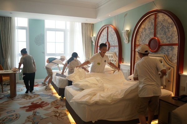学生们在酒店叠被子。景区供图